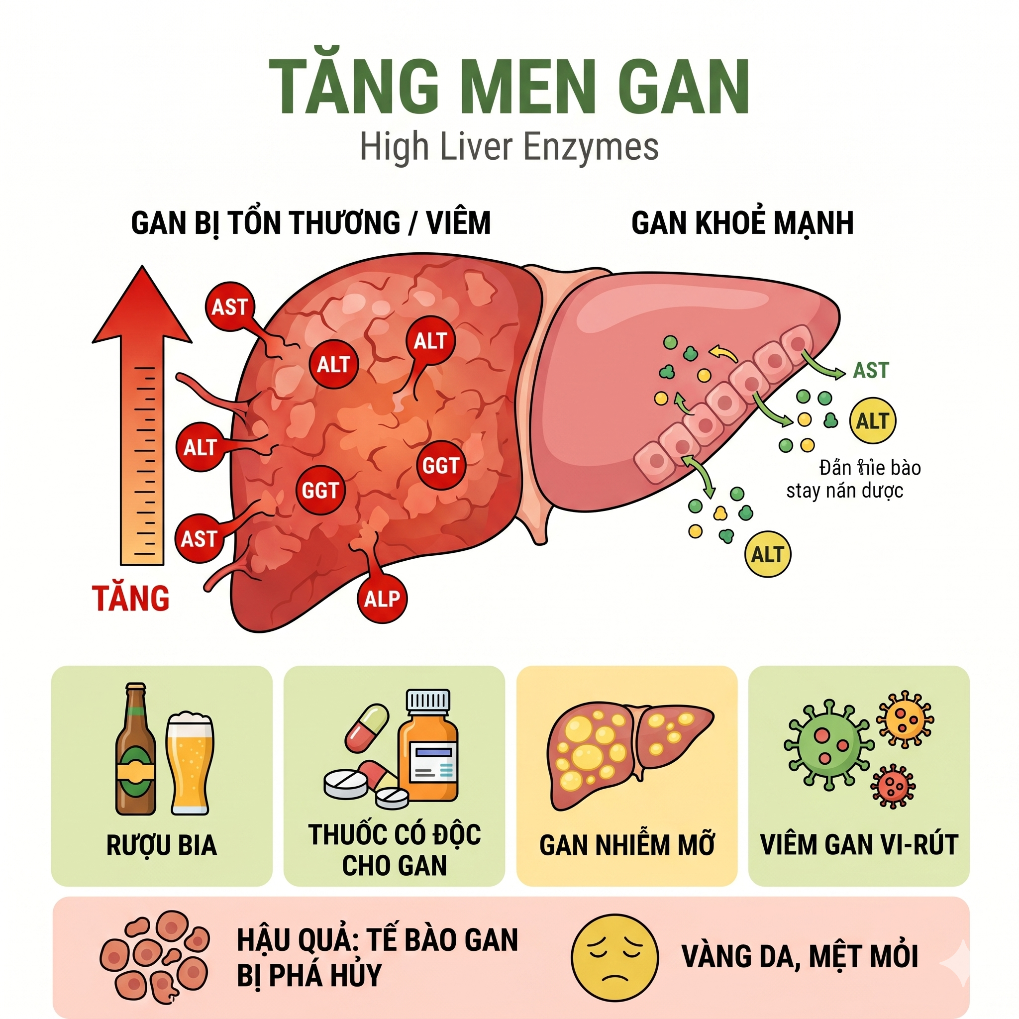 Tăng men gan (hay men gan cao) là tình trạng các tế bào gan đang bị phá hủy hoặc tổn thương hàng loạt. Khi màng tế bào gan bị vỡ, lượng enzyme này sẽ giải phóng và tràn vào máu, khiến nồng độ men gan trong máu tăng vọt so với mức giới hạn bình thường. Chỉ số men gan càng cao chứng tỏ mức độ tổn thương của gan càng nghiêm trọng.