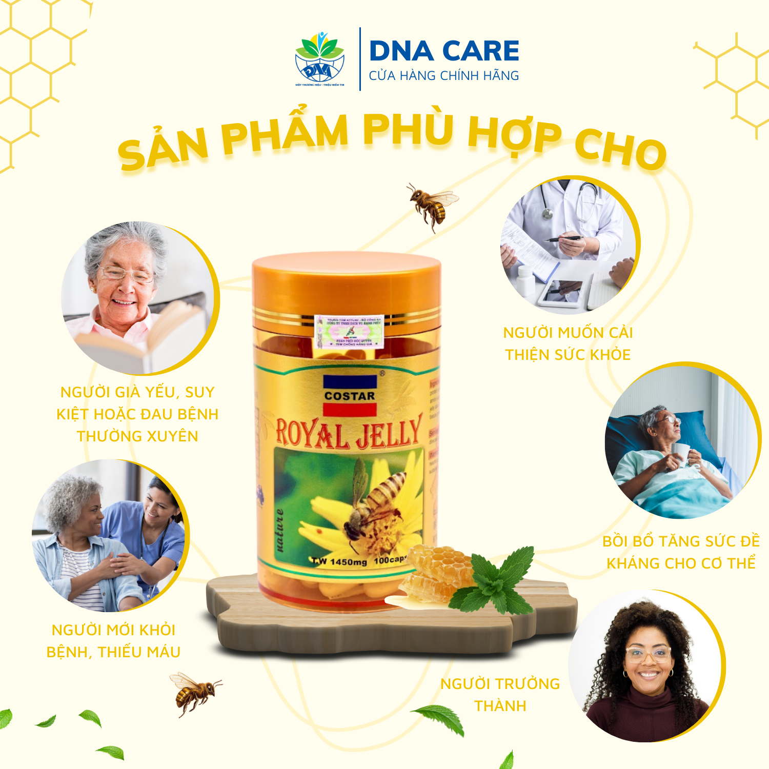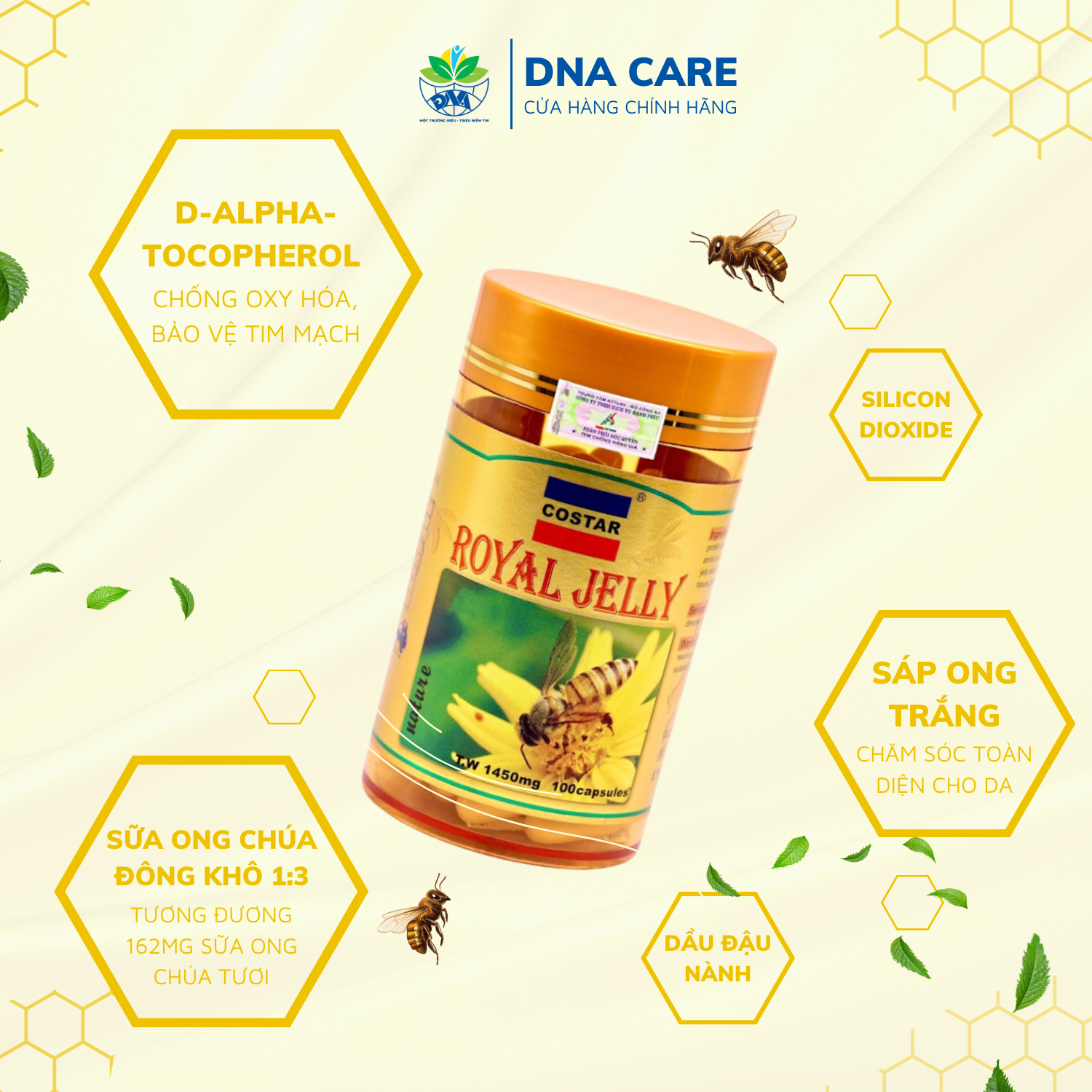 Viên uống sữa ong chúa Costar hàm lượng 1450mg chiết xuất từ 100% sữa ong chúa tươi nguyên chất có tác dụng tăng cường dưỡng chất, sức đề kháng cho cơ thể đồng thời làm đẹp da, ngăn ngừa lão hóa như nám, sạm da, tàn nhang