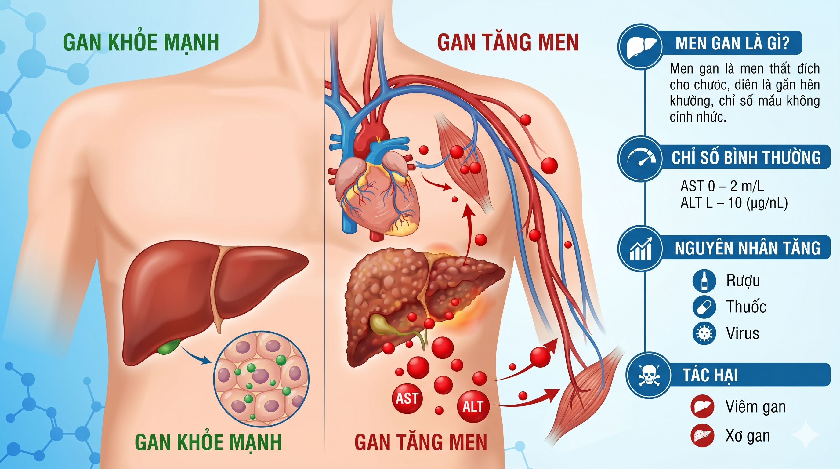 Gan là cơ quan nội tạng lớn nhất và đảm nhiệm hơn 500 chức năng sống còn của cơ thể, đặc biệt là chức năng thải độc. Khi gan bị tổn thương, một trong những dấu hiệu cảnh báo đầu tiên và phổ biến nhất là tình trạng tăng men gan. Vậy tăng men gan là gì, nó có nguy hiểm không và làm thế nào để đưa chỉ số này về mức an toàn?