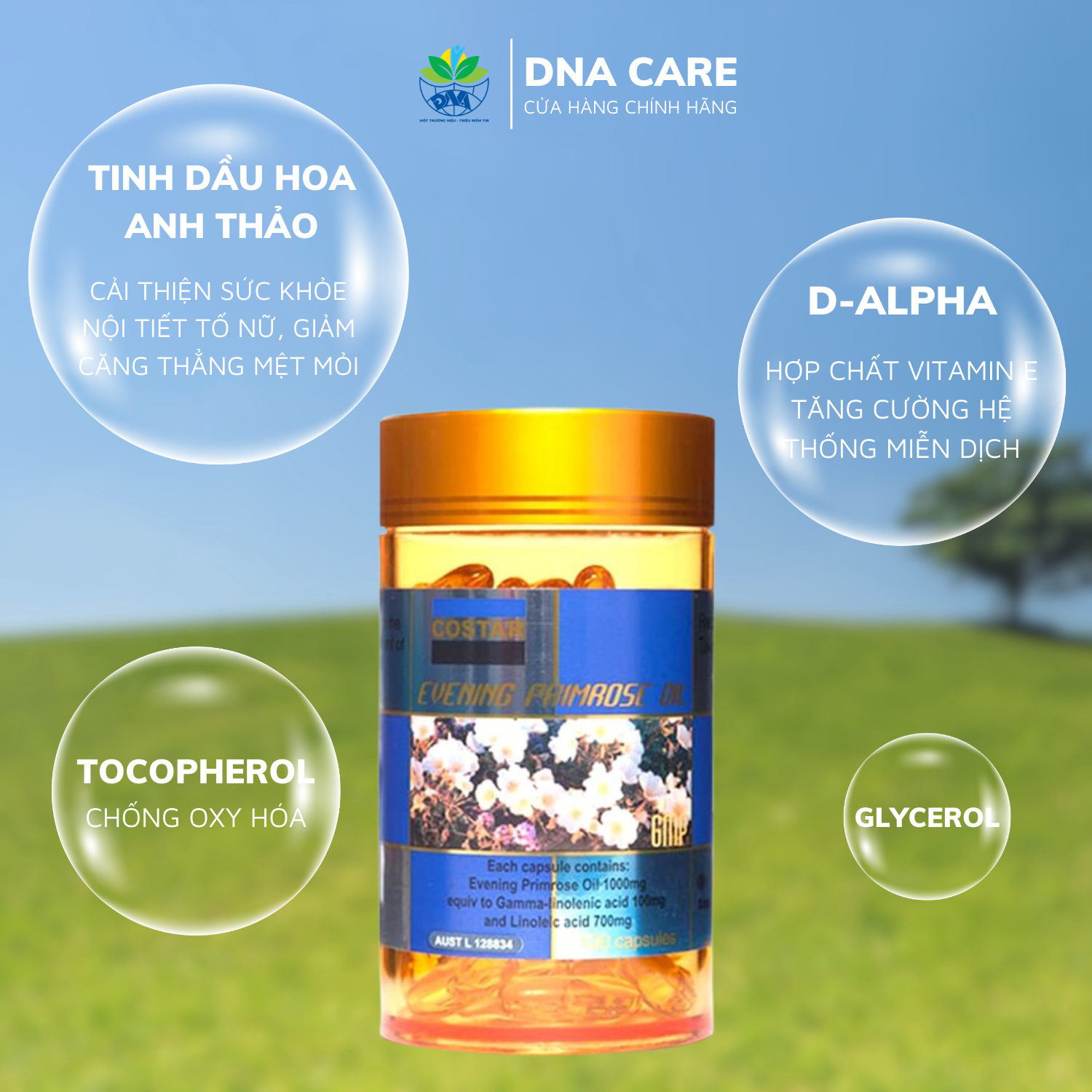 -Tinh dầu hoa anh thảo. Các thành phần khác: D-Alpha-Tocopherol,Gelatin, Glycerol, nước tinh khiết