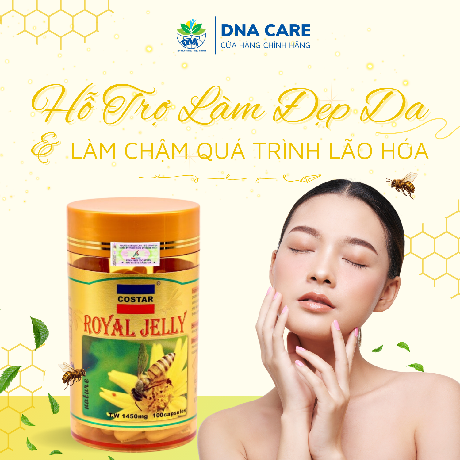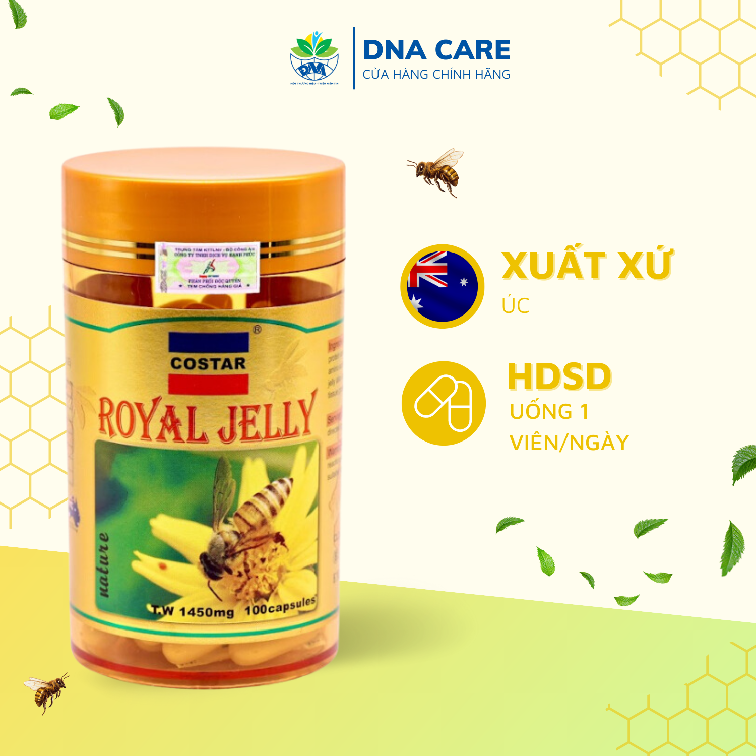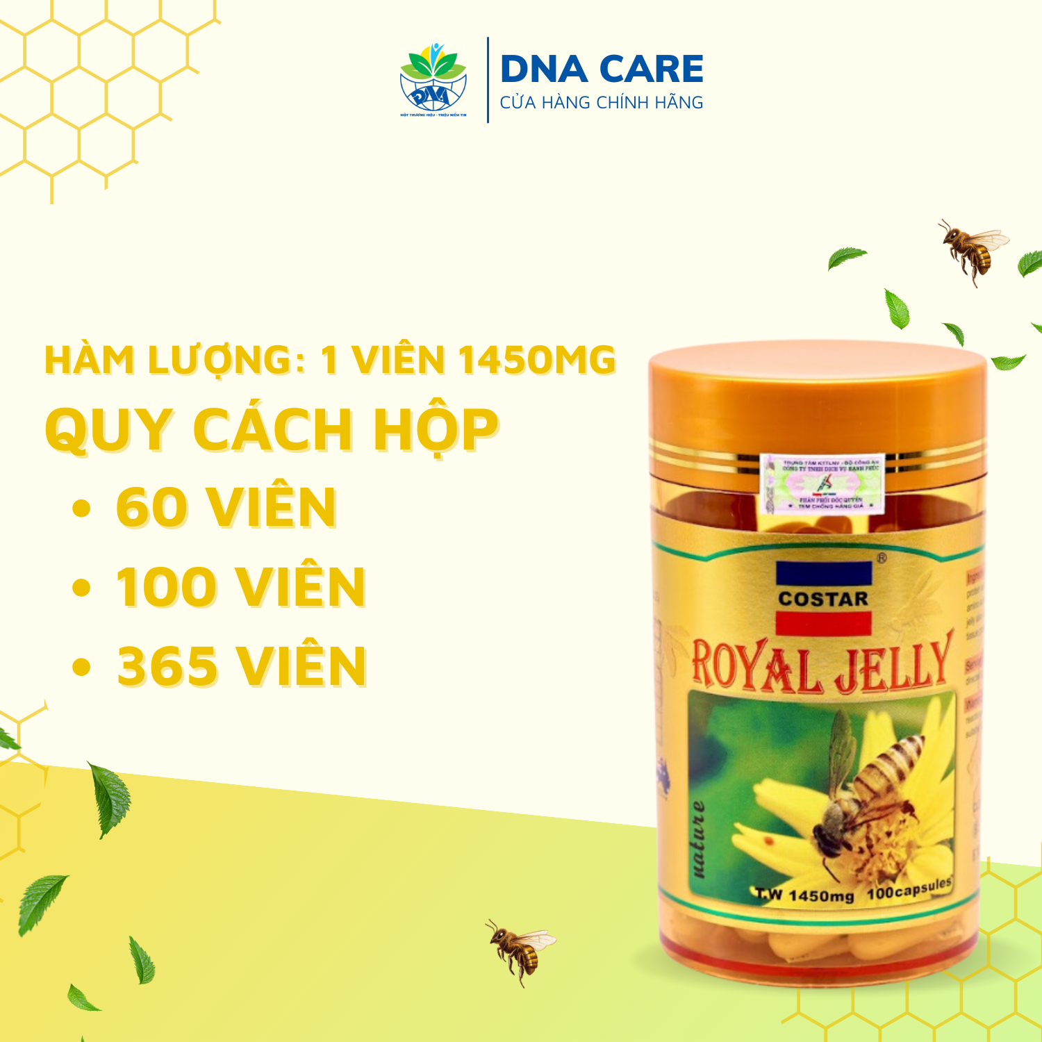 Viên uống sữa ong chúa Costar hàm lượng 1450mg chiết xuất từ 100% sữa ong chúa tươi nguyên chất có tác dụng tăng cường dưỡng chất, sức đề kháng cho cơ thể đồng thời làm đẹp da, ngăn ngừa lão hóa như nám, sạm da, tàn nhang